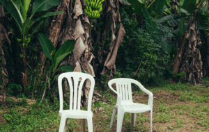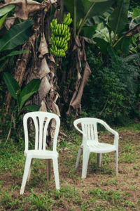An old rotary dial phone painted in all the colors of the rainbow sat atop a plastic table, its curved